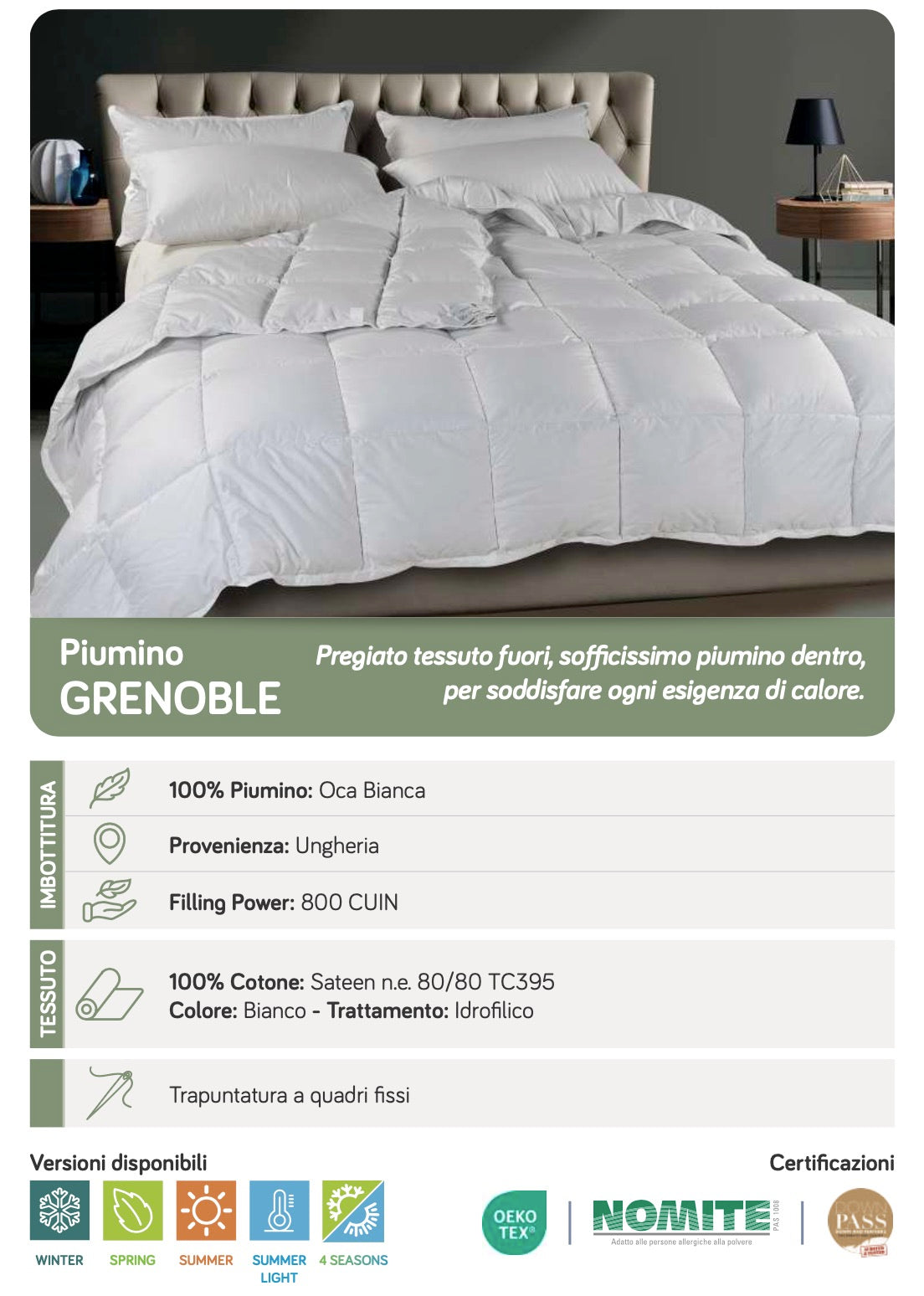 - **Piumino d'Oca Bianca Ungherese:** Il nostro piumino GRENOBLE è imbottito con piumino d'oca bianca ungherese di altissima qualità, noto per la sua leggerezza, morbidezza e capacità di mantenere una temperatura ottimale durante la notte.