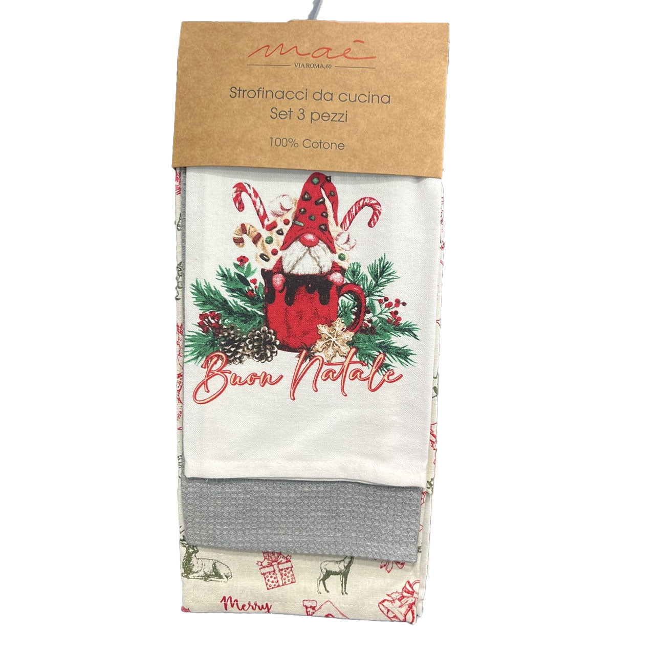 MAE' by VIA ROMA 60 Strofinacci da cucina 3 pezzi art. XMAS TIME var. GNOMO&TAZZA