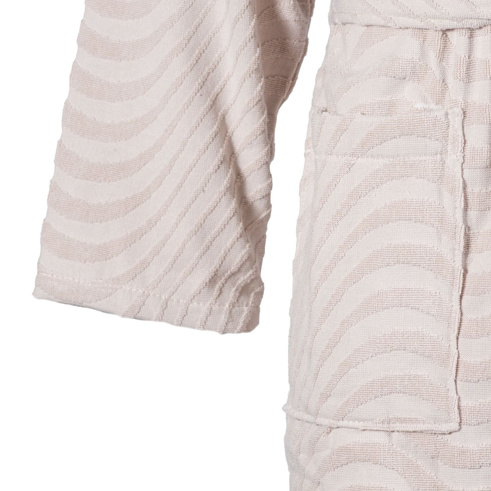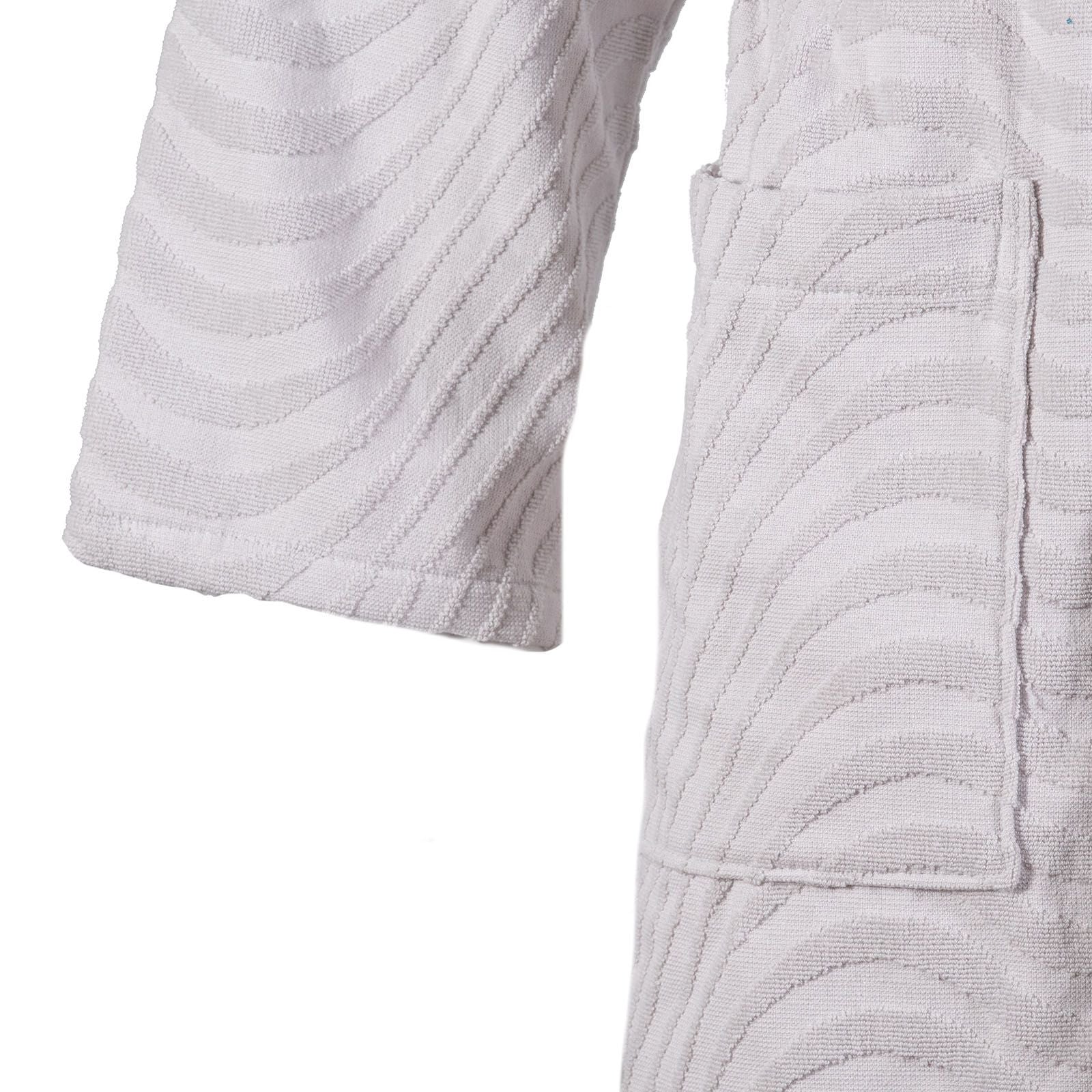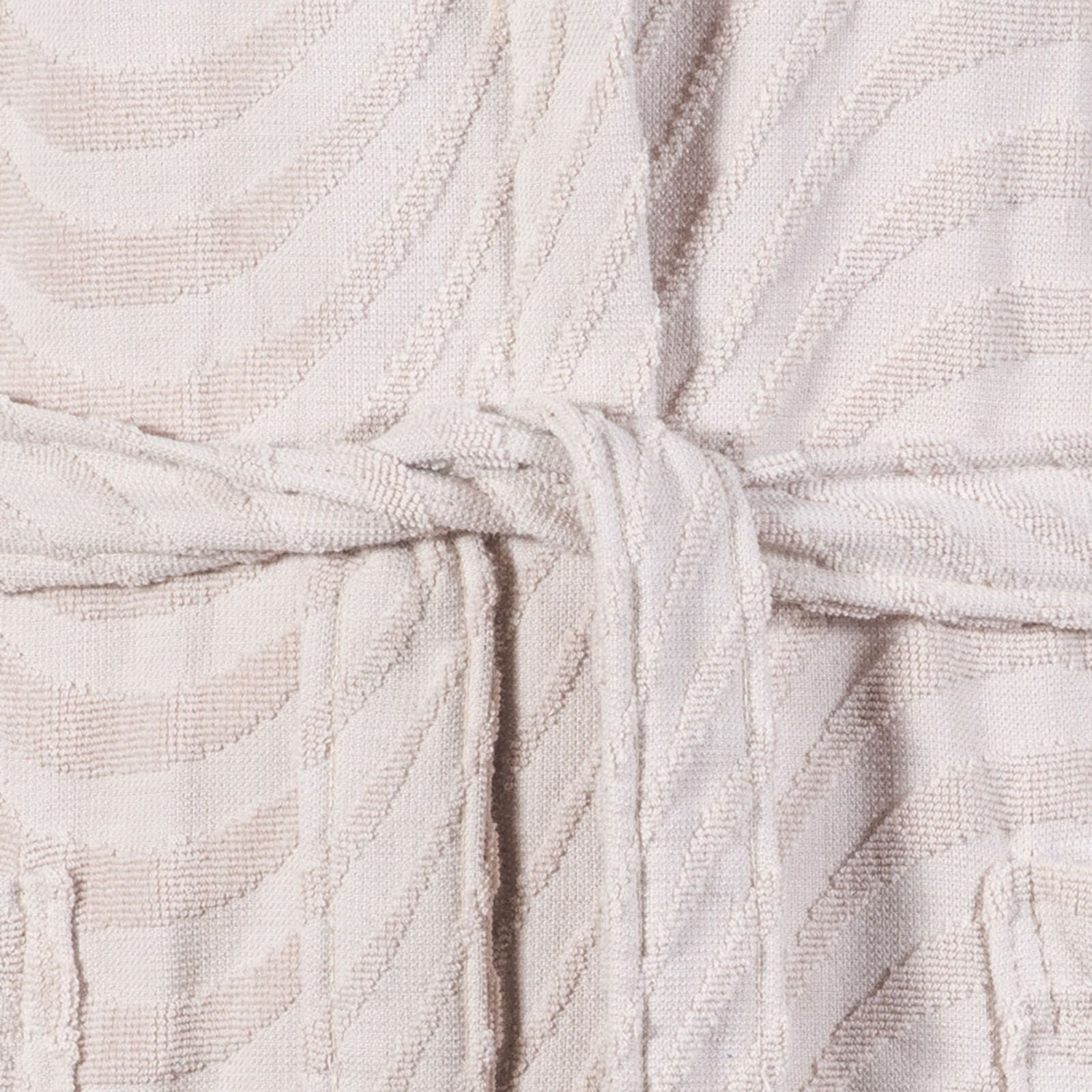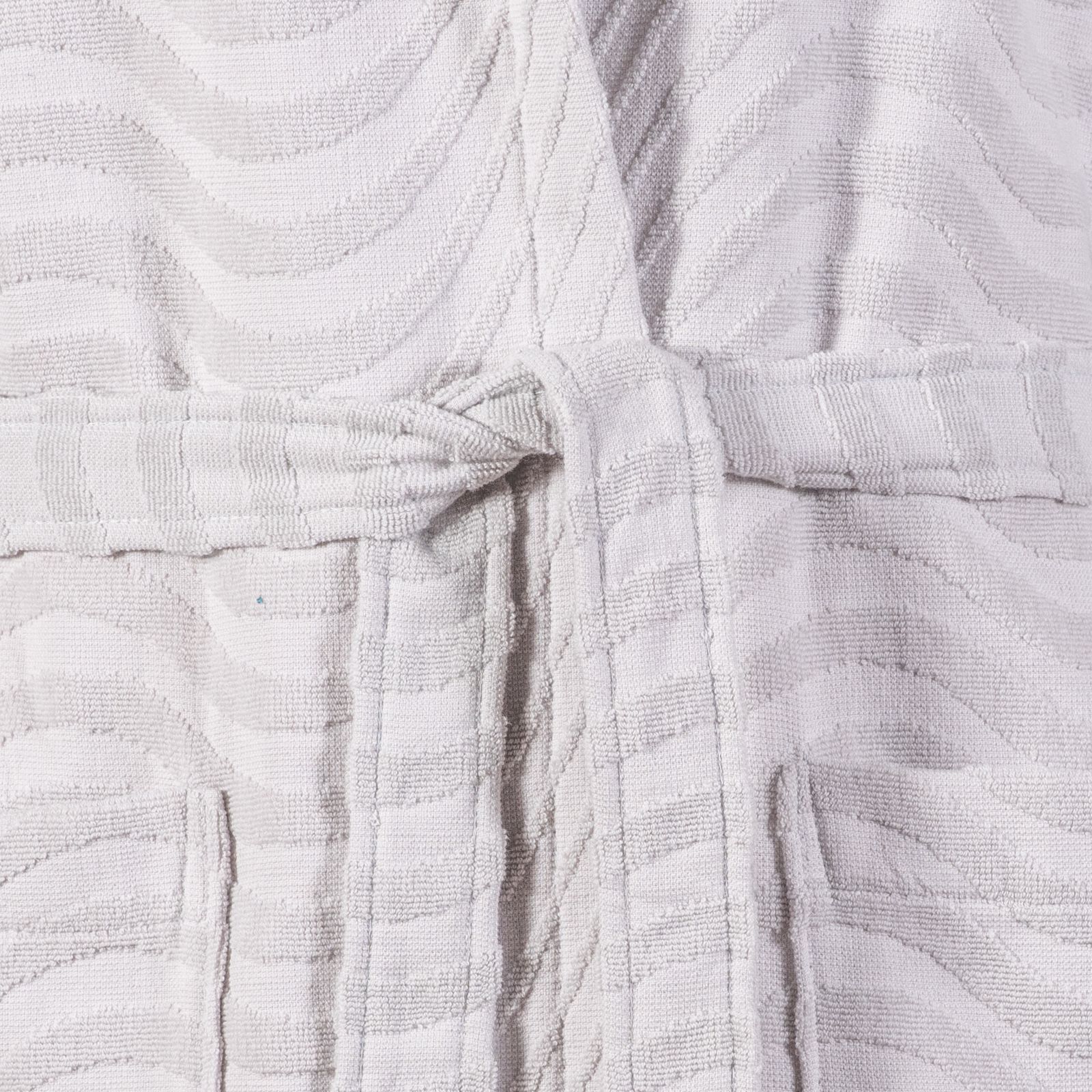Realizzato in morbida spugna tinta unita con un raffinato rilievo a dolci righe curve, questo accappatoio è perfetto per avvolgerti in una coccola di benessere dopo una lunga giornata.
