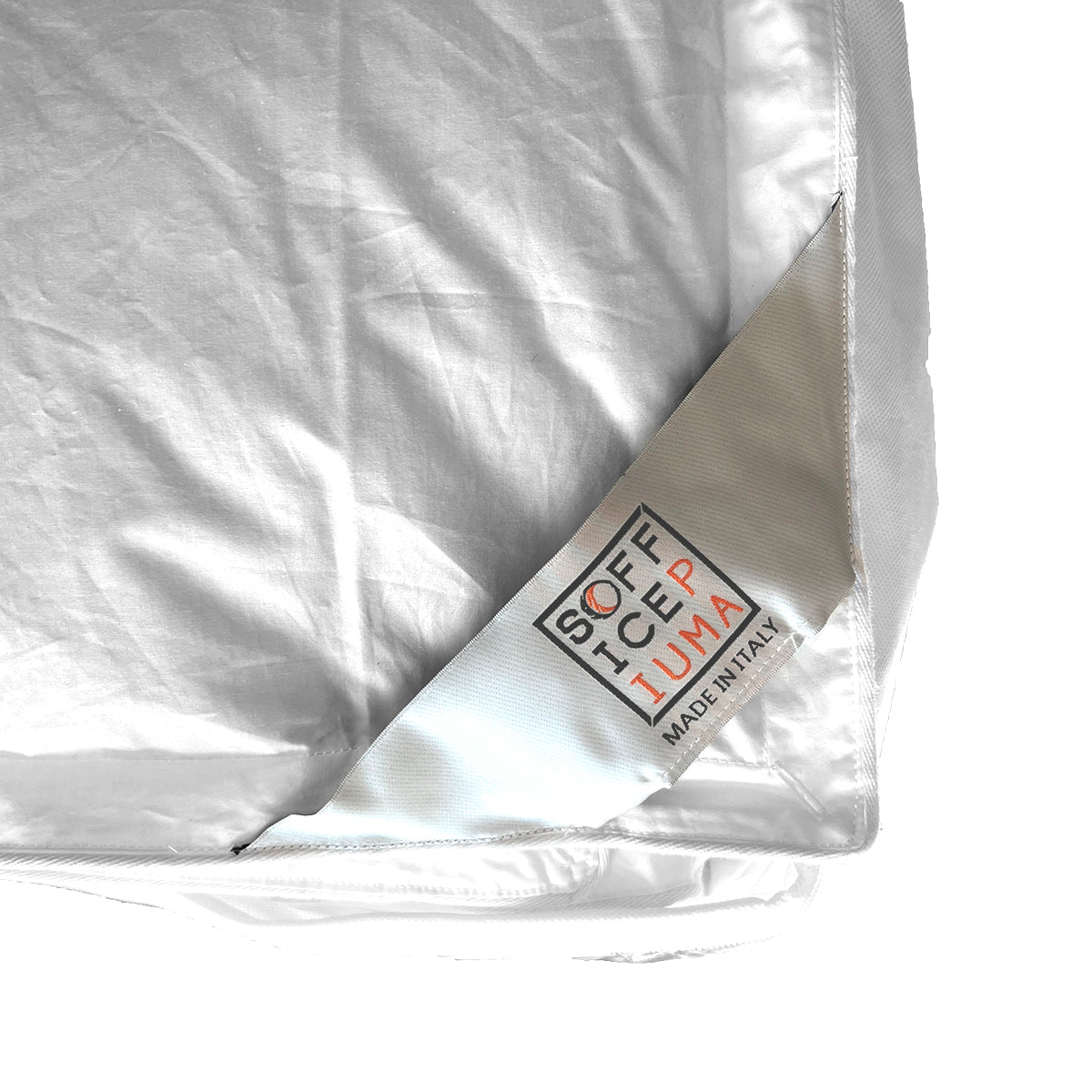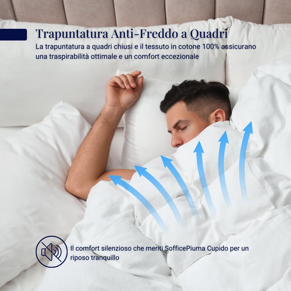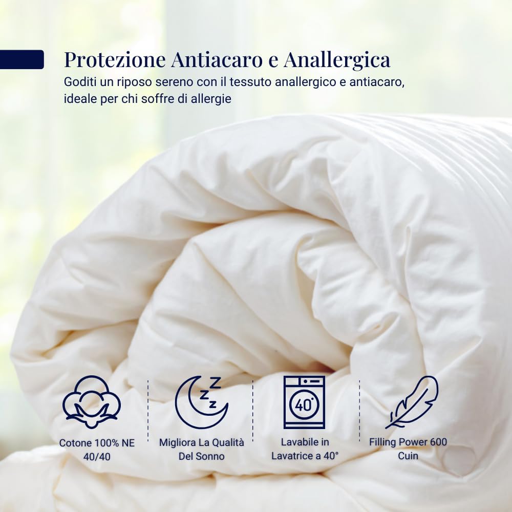 3. **Copertura Morbida e Durevole**: La copertura del nostro piumino è realizzata in tessuto 100% cotone 40/40 di alta qualità, morbido e silenzioso. È anche ipoallergenica, ideale per chi soffre di allergie, il cotone essendo a tenuta piuma è una barriera insormontabile per gli ACARI.